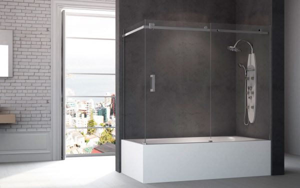 Modelo 650: Frontal baño, una fija + una hoja + fijo lateral hasta 90 cm – Cromo
