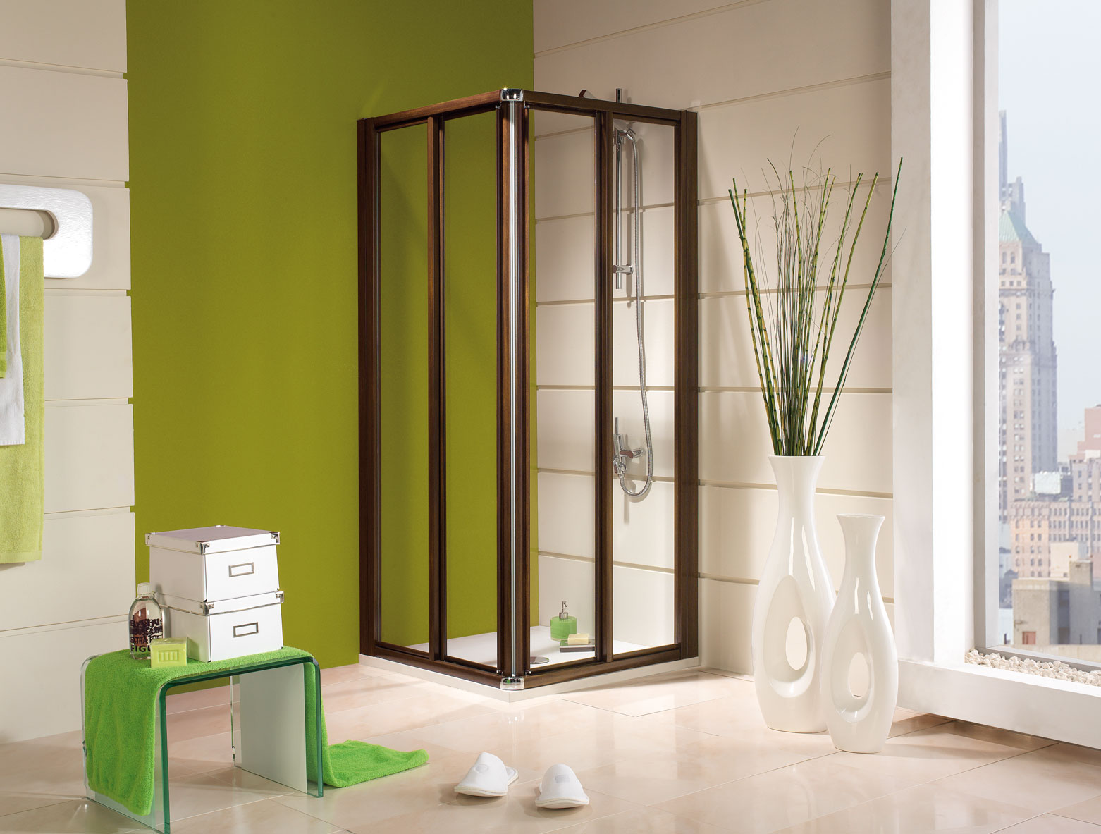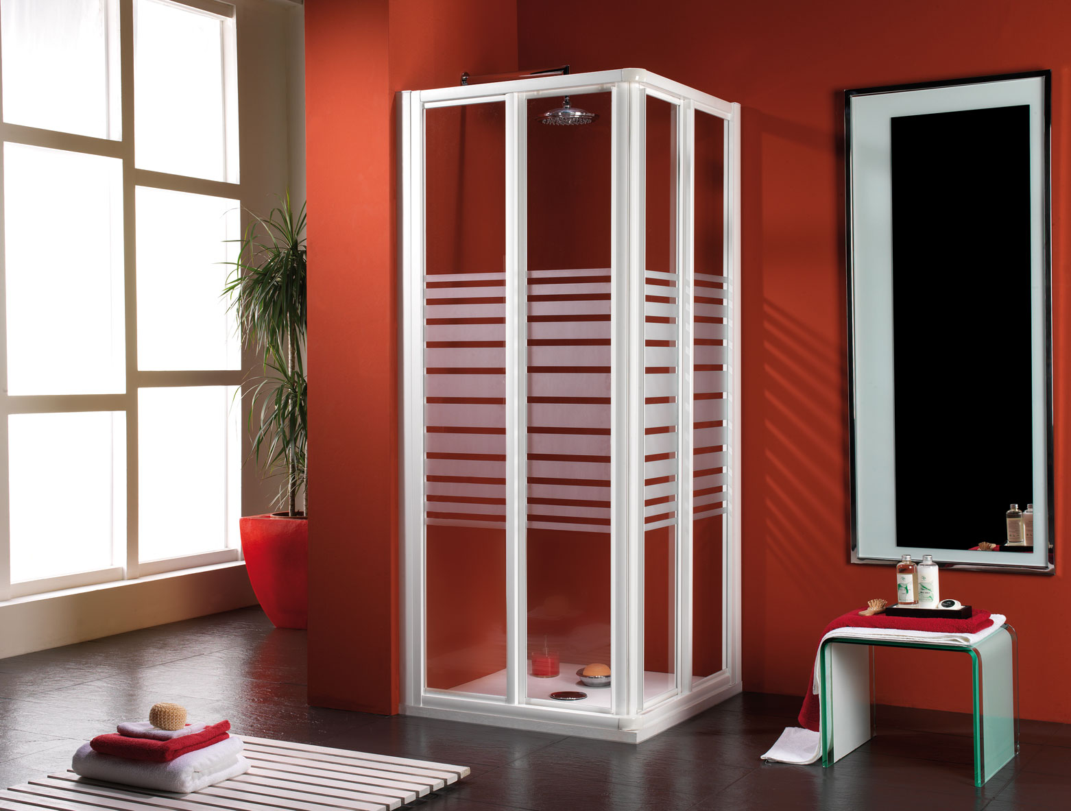 Model 1002: Douchewand hoek vier platen, twee x schuifdeur + twee x vast
