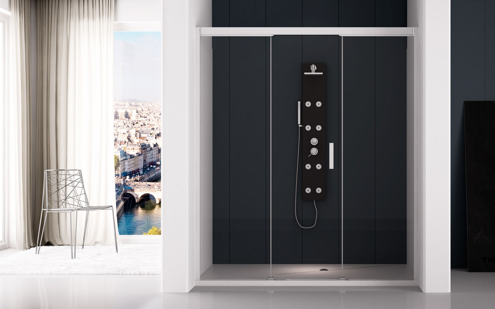 Model 503: Douchewand front drie platen, één schuifdeur + twee x vast – Wit