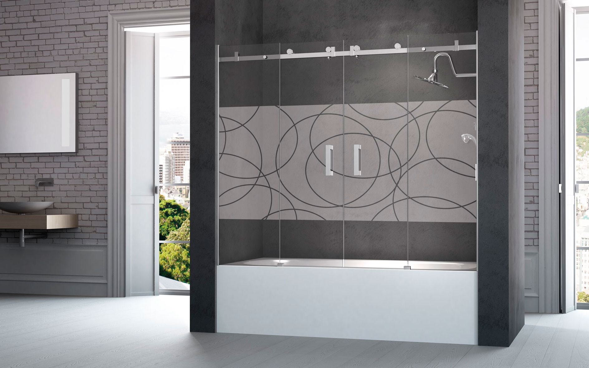 Model 654: Badwand front vier platen, twee x schuifdeur + twee x vast – Chroom